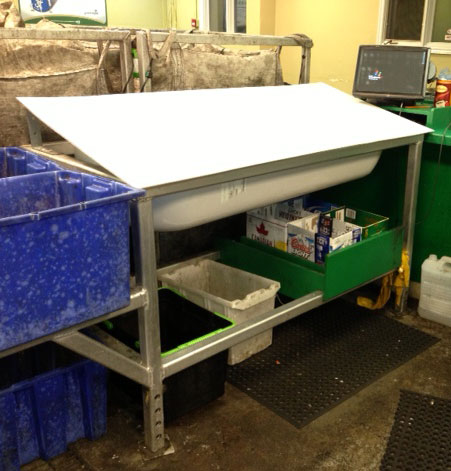 Yellow Environmental Inc. in conjunction with its partner Ever Green Recycling, developed advanved sorting/count tables for the bottle depot. The design is made from aluminum to be as light and strong as possible with adjustable legs to account for different heights. The table features a removable plastic bath tub insert which can be replaced as needed but is also easy to keep clean and looks tidy. The tub drains all the liquid from the recyclables into a floor trough hidden from customer view. The tub is setup on an angle to make it more ergonomic for the employee.